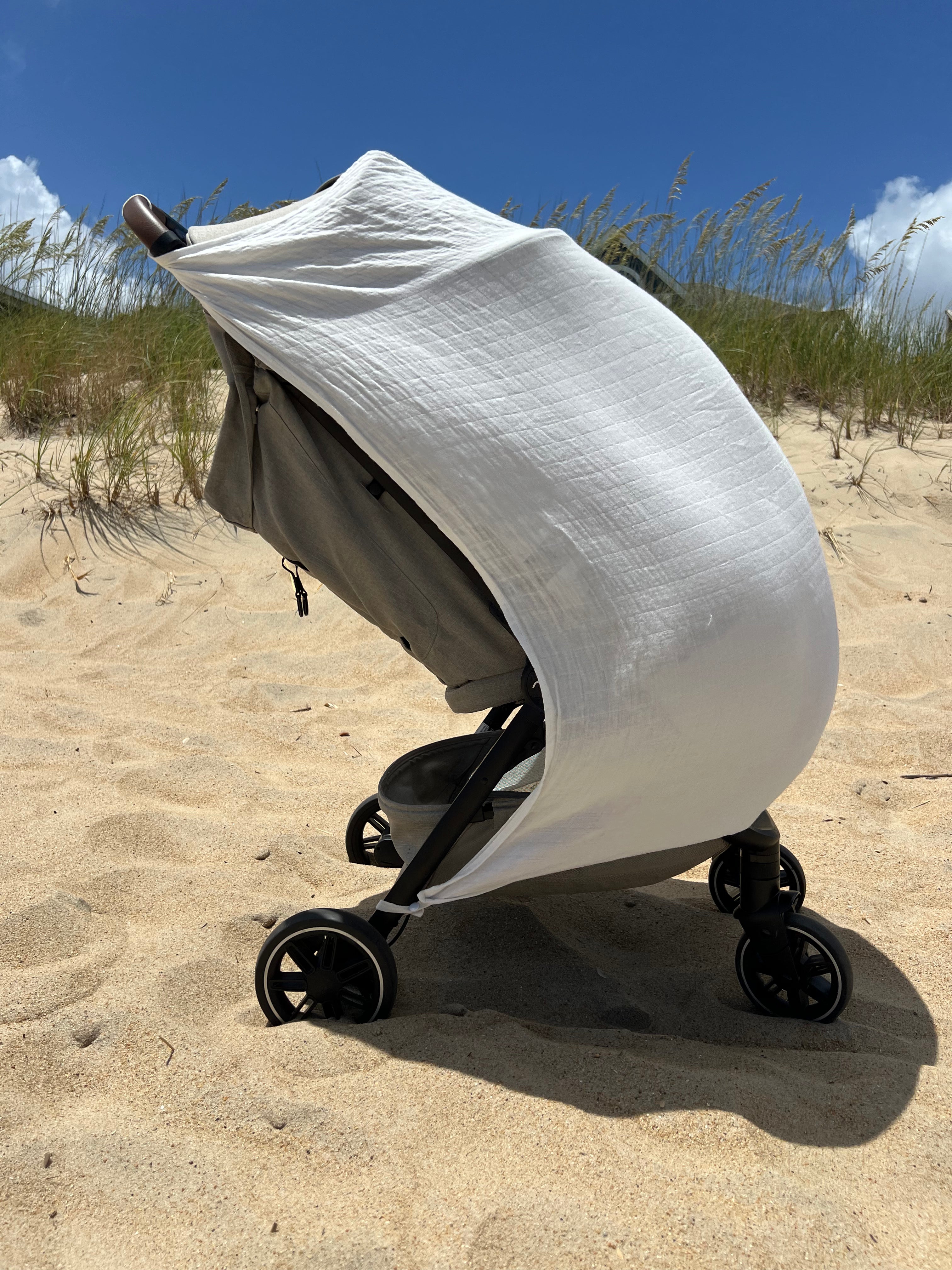 Tired of having a blanket malfunction wake the sleeping baby? Or if your baby is like mine, they can't even think about closing their eyes with the world going on around them. The Cover is for you. A soft double layered cotton muslin 45"x45" blanket with four durable straps so that you can fasten The Cover to any stroller, car seat, door, chair, tree- you name it. Designed to fit any stroller or car seat it is breathable, soft and functional.